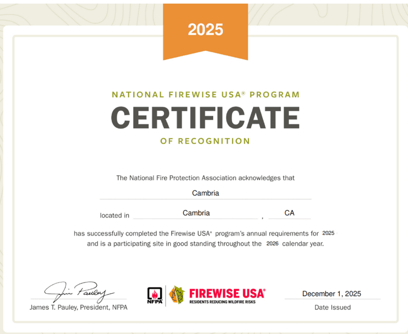 We are thrilled to announce that Cambria has officially been recognized as a Firewise USA® community! This prestigious designation reflects our collective commitment to wildfire preparedness and safety, a vital step for protecting our beautiful town and its residents from the increasing threat of wildfires.
