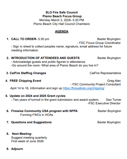 Pismo Beach Fire Safe Focus Group at City Hall Passcode: QT^F3HC%